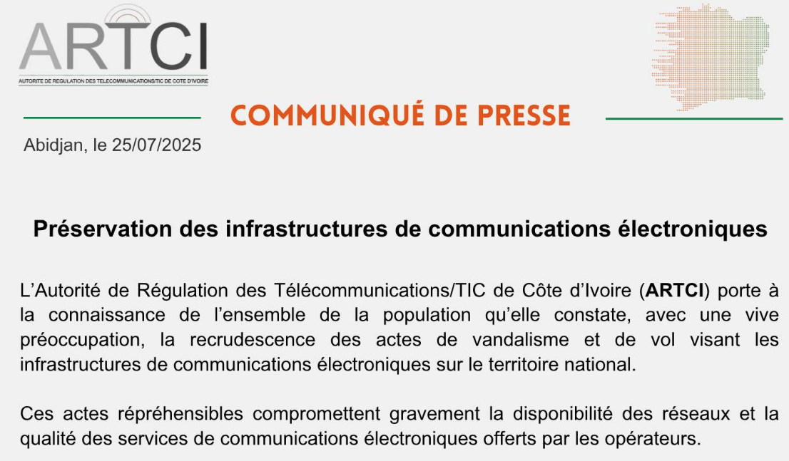 ActualitéCommuniqué ARTCI : Préservation des infrastructures de communications électroniques juillet 25, 2025décembre 9, 20257496 Share0