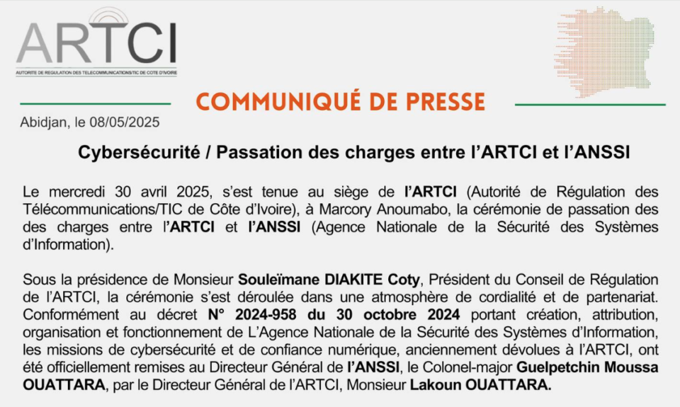 ActualitéCommuniqué | Cybersécurité : Passation des charges entre l’ARTCI et l’ANSSI mai 8, 2025décembre 11, 202510797 Share0