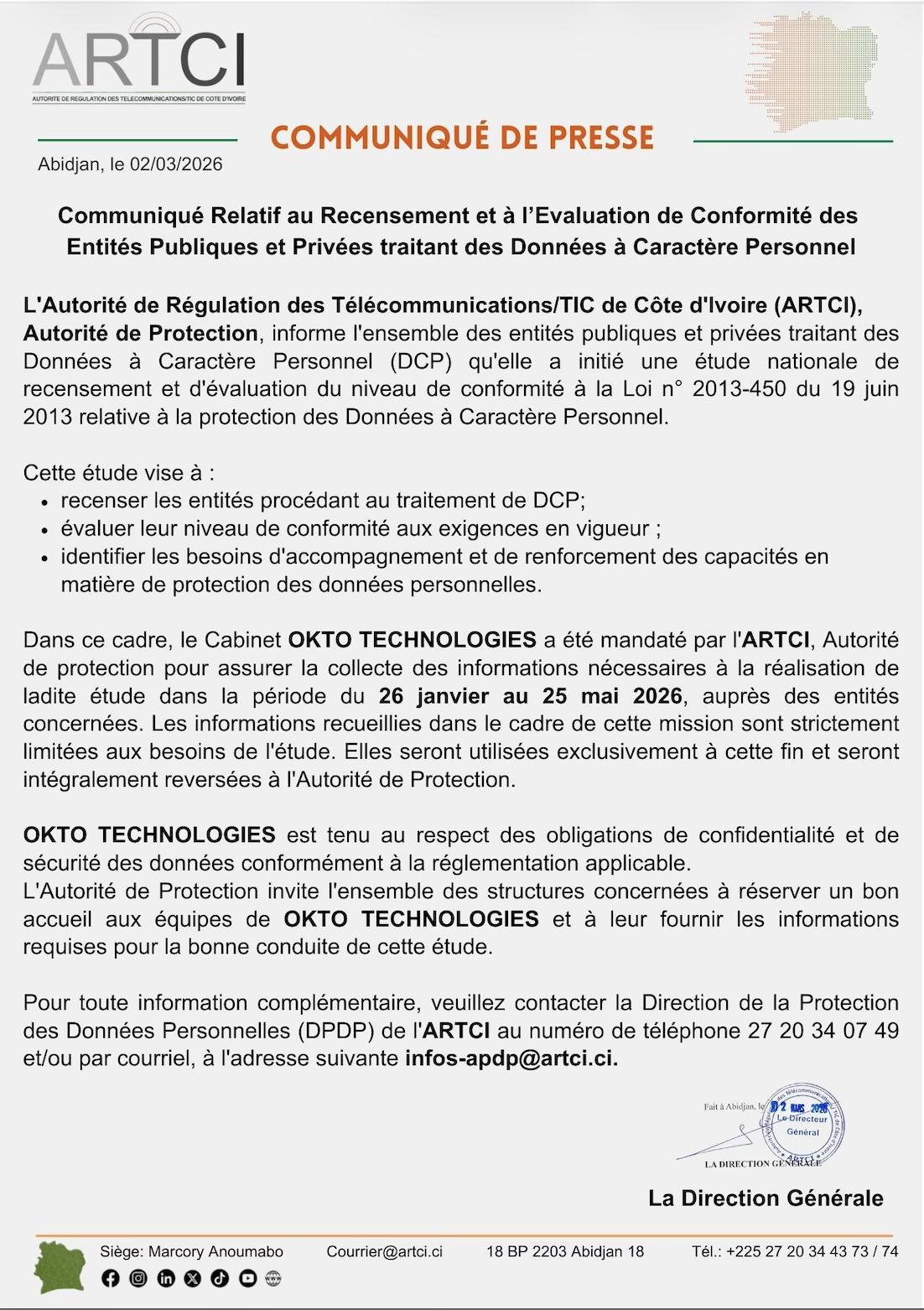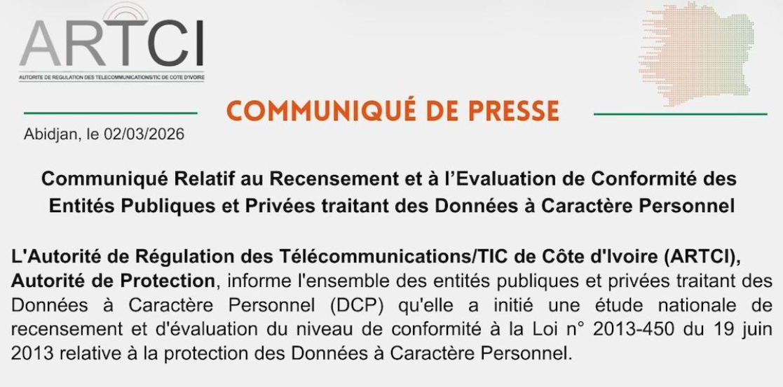 ActualitéCommuniqué de presse ARTCI : Recensement et Evaluation de Conformité des Entités Publiques et Privées traitant des Données à Caractère Personnel mars 2, 2026avril 1, 20268906 Share0