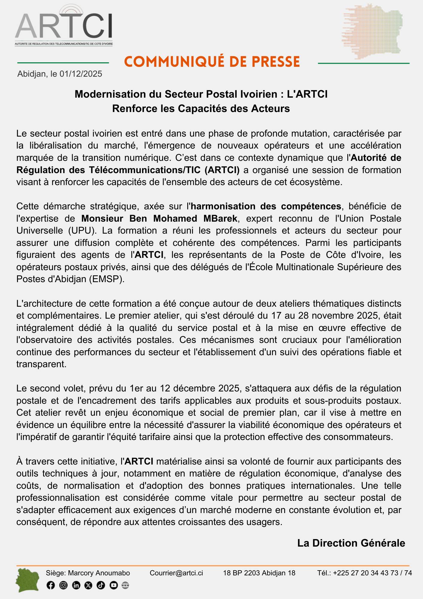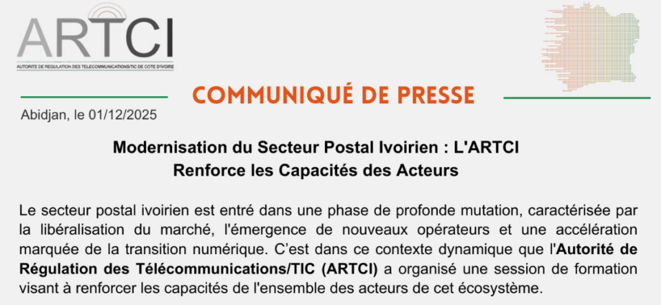 Actualité[Communiqué de Presse] Modernisation du Secteur Postal Ivoirien : L’ARTCI Renforce les Capacités des Acteurs décembre 1, 2025décembre 9, 20259848 Share0