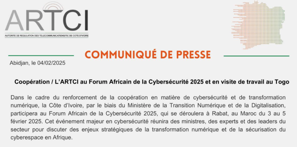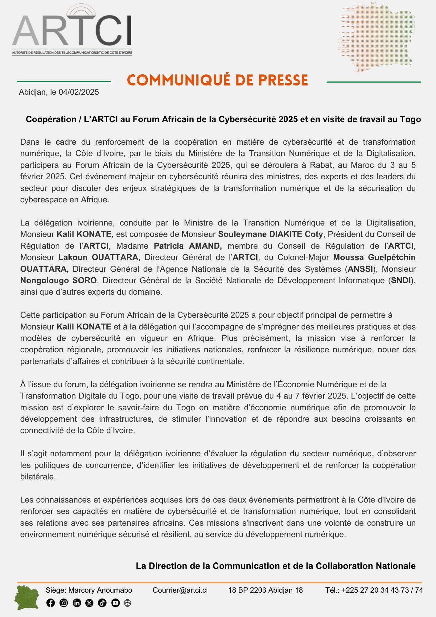 ActualitéCommuniqué : L’ARTCI au Forum Africain de la Cybersécurité 2025 et en visite de travail au Togo février 4, 2025décembre 10, 20256384 Share0