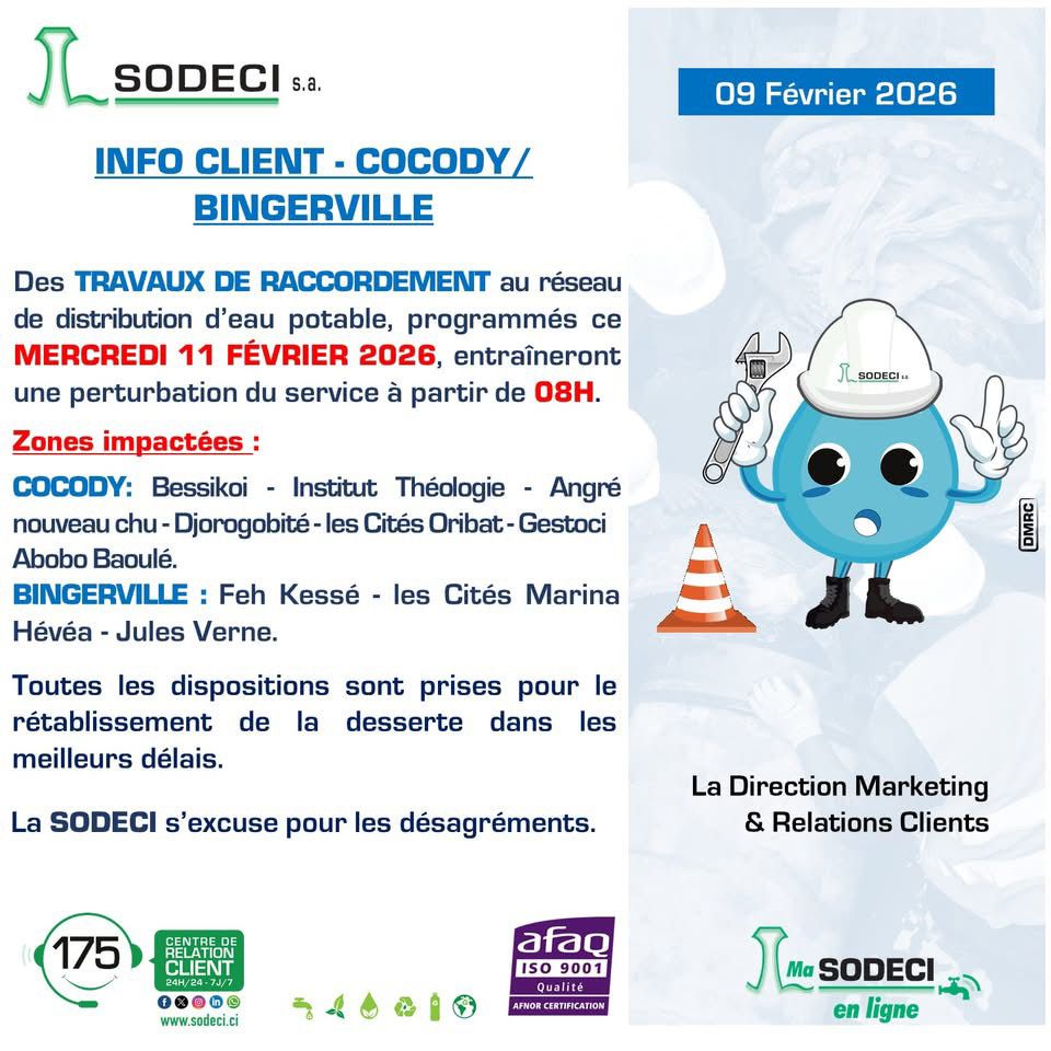 La SODECI porte à la connaissance de la population que des travaux de raccordement du réseau de distribution d’eau potable, programmés ce mercredi 11 Février 2026, entraîneront une perturbation du service à partir de 08h.