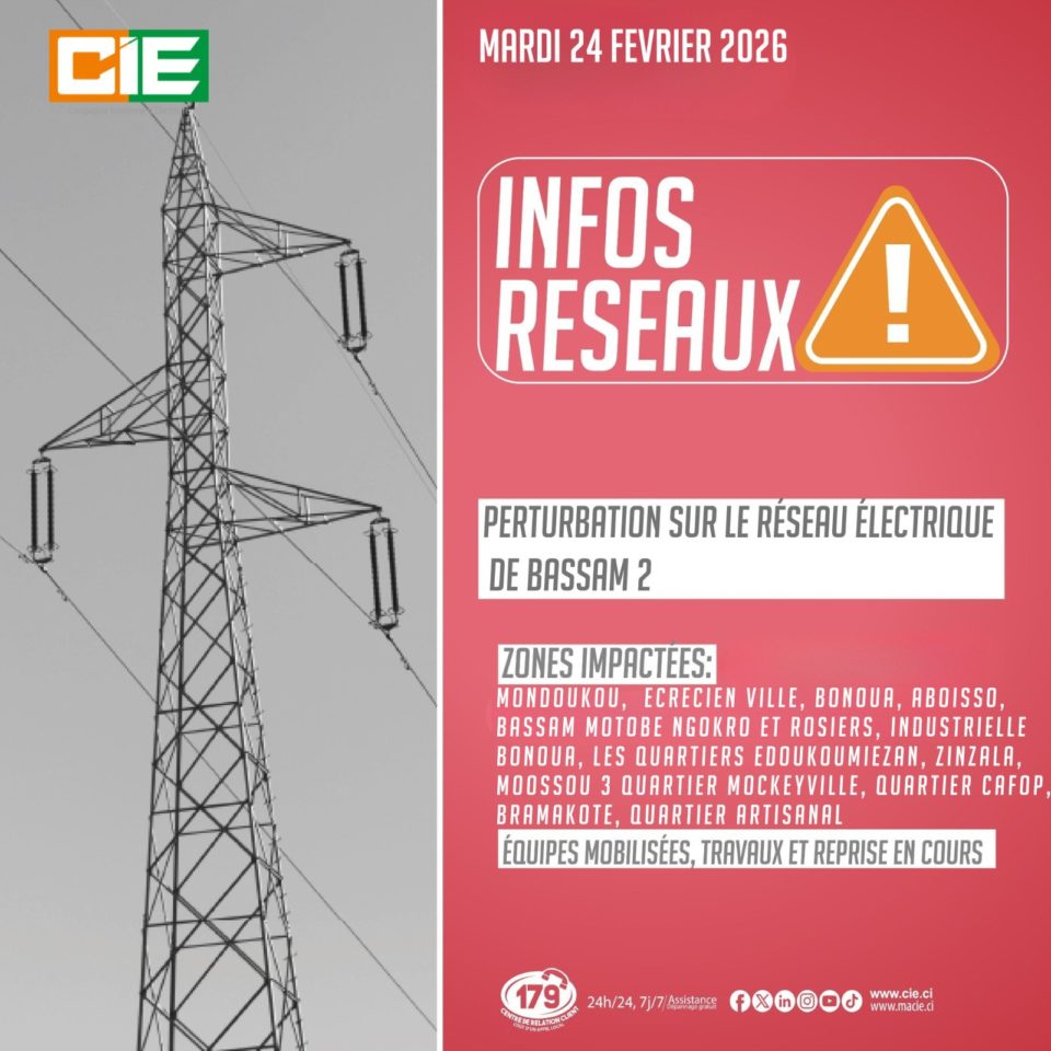 ActualitéInfos CIE : Perturbation sur le réseau électrique de Bassam 2 février 24, 2026février 25, 202621 Share0 Plusieurs zones de la ville de Bassam sont impactées par une perturbation du réseau électrique. Les équipes de la CIE sont mobilisées, les travaux sont en cours pour la reprise.