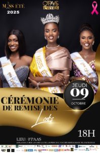 La cérémonie de remise officielle des lots la MISS Aminata Nicole et de ses dauphines se déroulera ce jeudi 9 Octobre à l’établissement OPAAS chez Prince Alex, à partir de 18h.