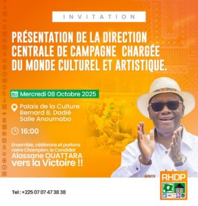Au-delà d’un simple dévoilement d’organigramme, cette rencontre politique et culturel majeur marquera une prise de position stratégique du RHDP en direction des acteurs culturels, en vue de la présidentielle du 25 octobre.