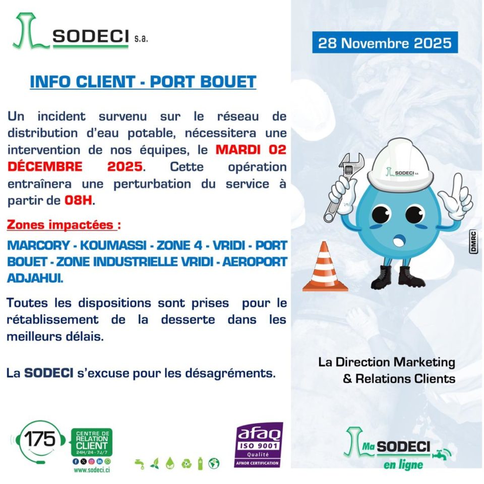 Zones impactées : MARCORY – KOUMASSI – ZONE 4 – VRIDI – PORT BOUET – ZONE INDUSTRIELLE VRIDI – AEROPORT – ADJAHUI.