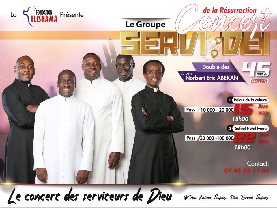 Le Sofitel Hôtel Ivoire d’Abidjan et le palais de la culture seront les témoins privilégiés des concert-évènement du groupe SERVI DEI doublé de la célébration des 45 ans de sacerdoce du père Norbert Eric ABEKAN, les 15 et 22 Avril 2023.